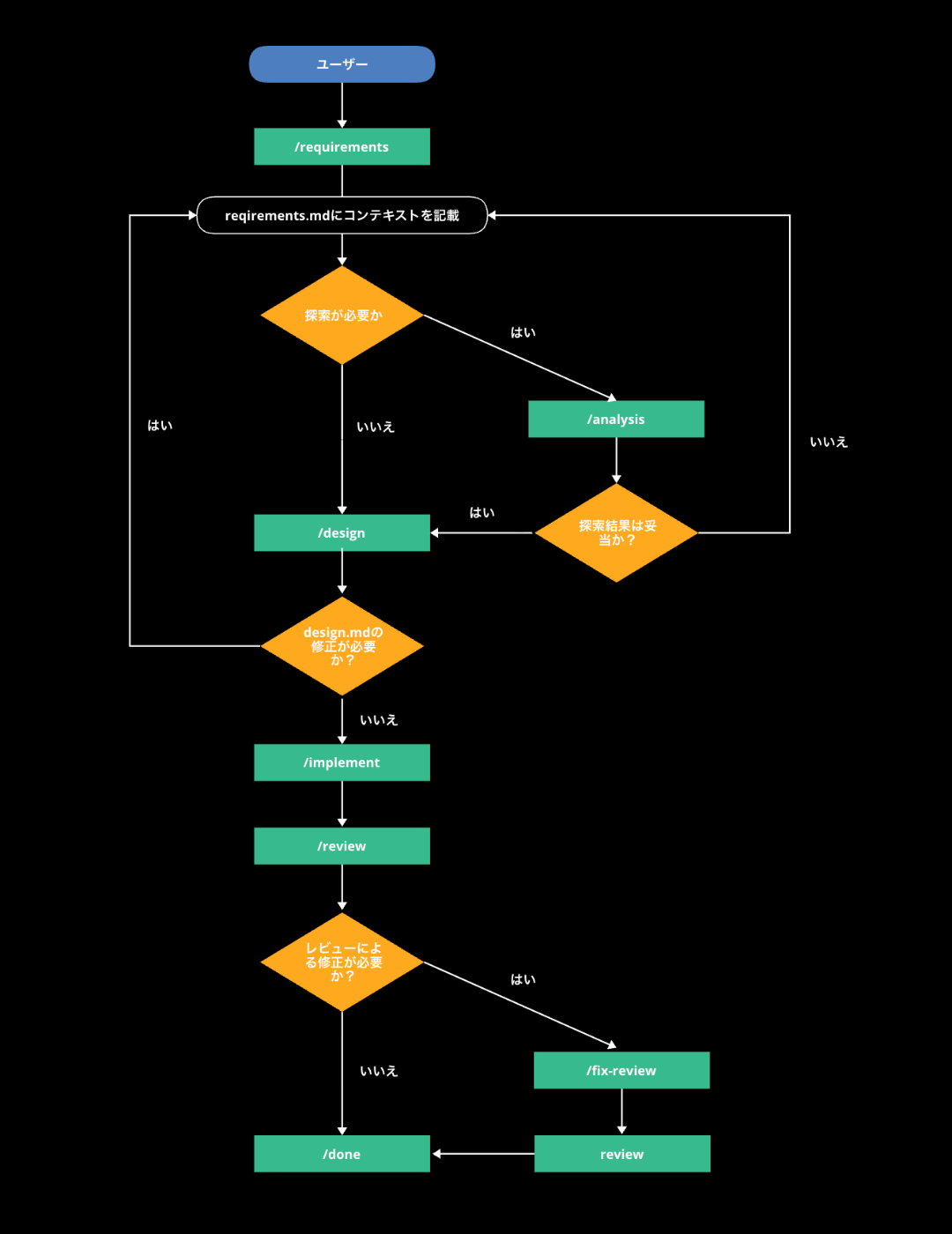 前段で/analysisコマンドを実行している際は、参照できるようにrequirements.mdにanalysis.mdファイルのパスを記載します。design.mdをレビューし、修正点がある場合は、requirements.mdに加筆修正を加え、再度/designコマンドを実行します。/implementsコマンドで、design.mdを引数に渡し、実装します。/reviewコマンドの引数にdiffファイルを渡し、実装した内容をレビューします。- レビューによる修正が必要な場合は、