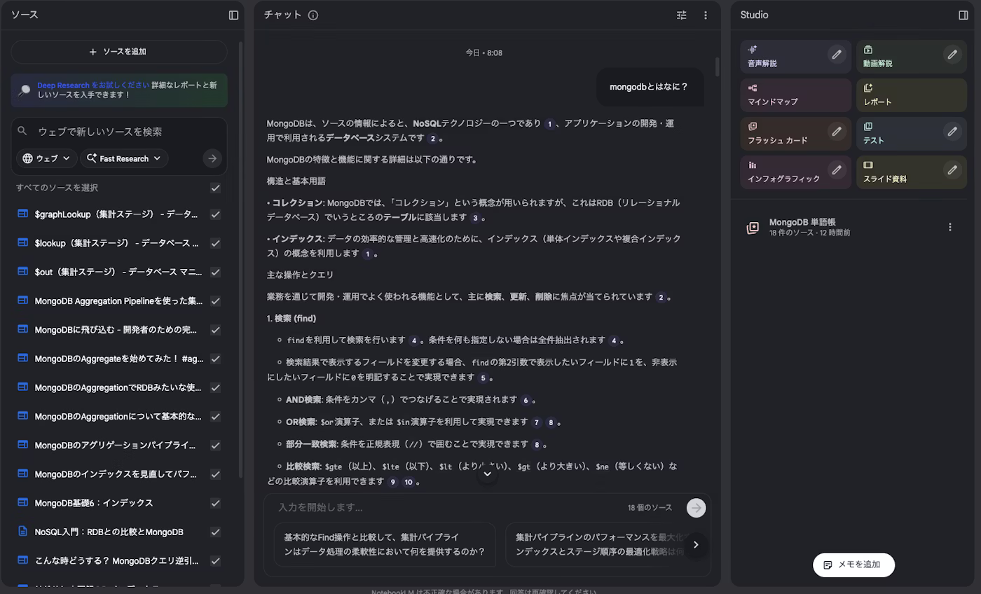 これは、単なるチャットボットではなく「学習用ノート」として設計されたNotebookLMならではの強みです。