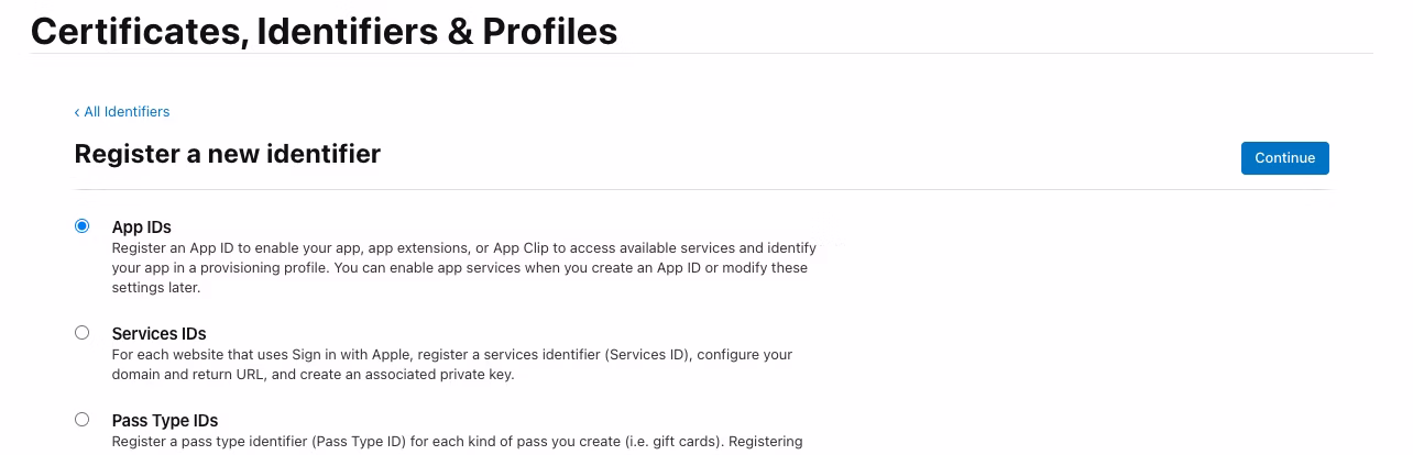 App IDsを選択しContinueをクリック。
