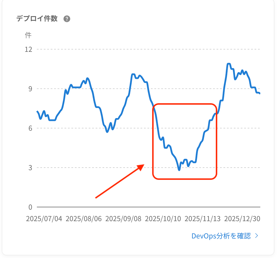 メンバー増員時のデプロイ件数の減少(赤枠)